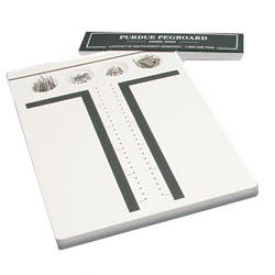 The Purdue Pegboard Test was first developed by Joseph Tiffin, Ph.D., an Industrial Psychologist at Purdue University in 1948. Since that time, this device has been used extensively to aid in the selection of employees for jobs that require fine and gross motor dexterity and coordination. It measures gross movements of hands, fingers and arms, and fingertip dexterity as necessary in assembly tasks. The pegboard is complete with pins, collars and washers and an examiner\’s manual with norms.